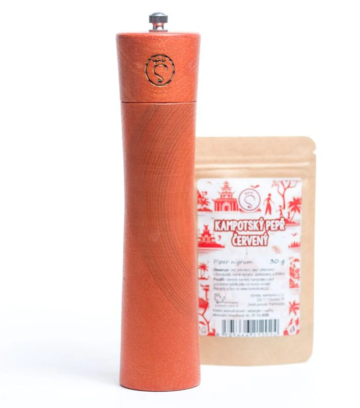 Součástí mlýnku je 30 g sáček červeného kampotského pepře.